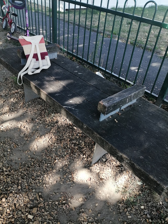 Aujourd’hui j’étais en avance pour récupérer mon grand à son atelier de formation et j’ai donc décidé d’aller me mettre à l’ombre dans le tout petit parc pour les enfants, situé juste à côté… Il faut dire que cuire dans la voiture sur le parking, pendant 20 mn, n’était vraiment pas réjouissant ! Donc j’ai repéré un banc et je me suis dis, chouette je vais m’asseoir là, tranquillou et scroller sur facebook pendant que je l’attends…