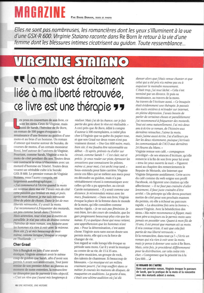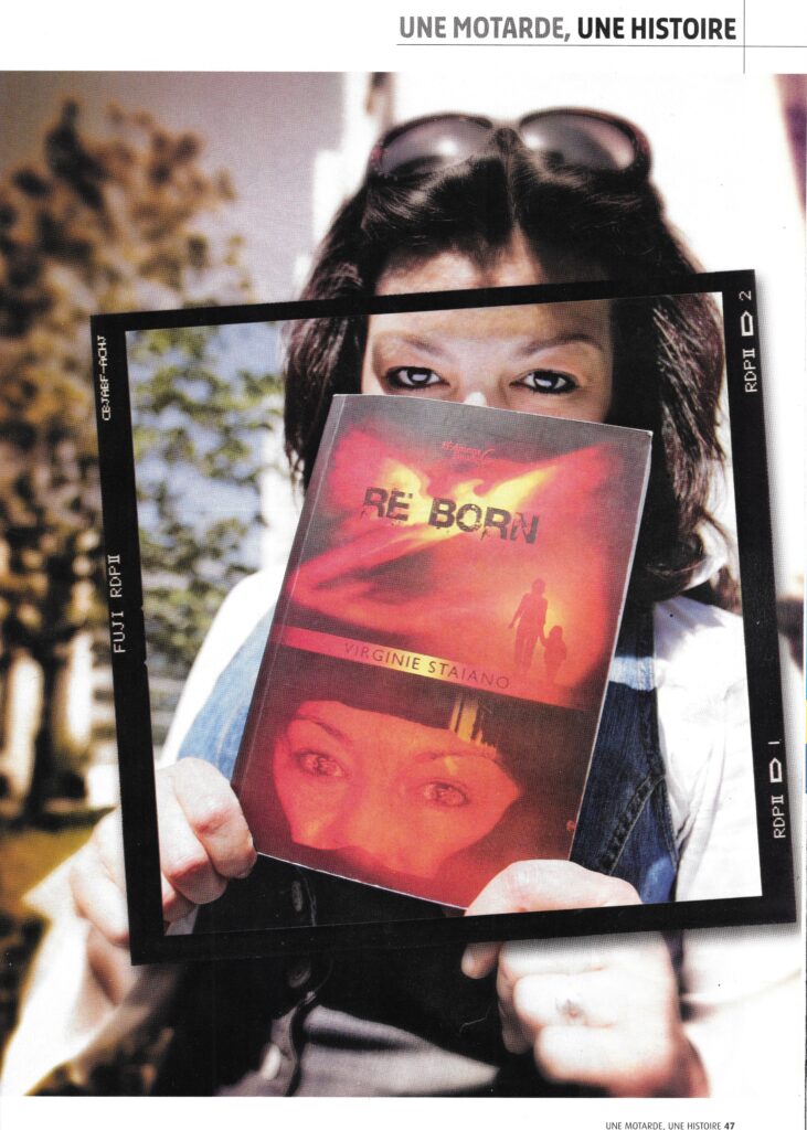 Lors de la première édition de RE BORN, David Dumain, alors rédacteur en chef de Moto Journal, m’avait fait l’honneur de m’écrire un très bel article. L’article, et sa toute aussi belle photo, signée également de David Dumain ont une belle place dans mon p’tit coeur sensible de romancière. Ce moment suspendu de confidences, et dégustation de sushis (faut bien se nourrir^^) à Issy les Moulineaux, en ce joli moi de mai 2010, est resté gravé dans ma mémoire pour toujours, aussi je me fais une joie de vous le partager. Et puis… Sait-on jamais, peut-être qu’un jour, ce moment pourrait se reproduire… Oui, sait-on jamais ce qu’une romancière a dans ses tiroirs ?! 😉